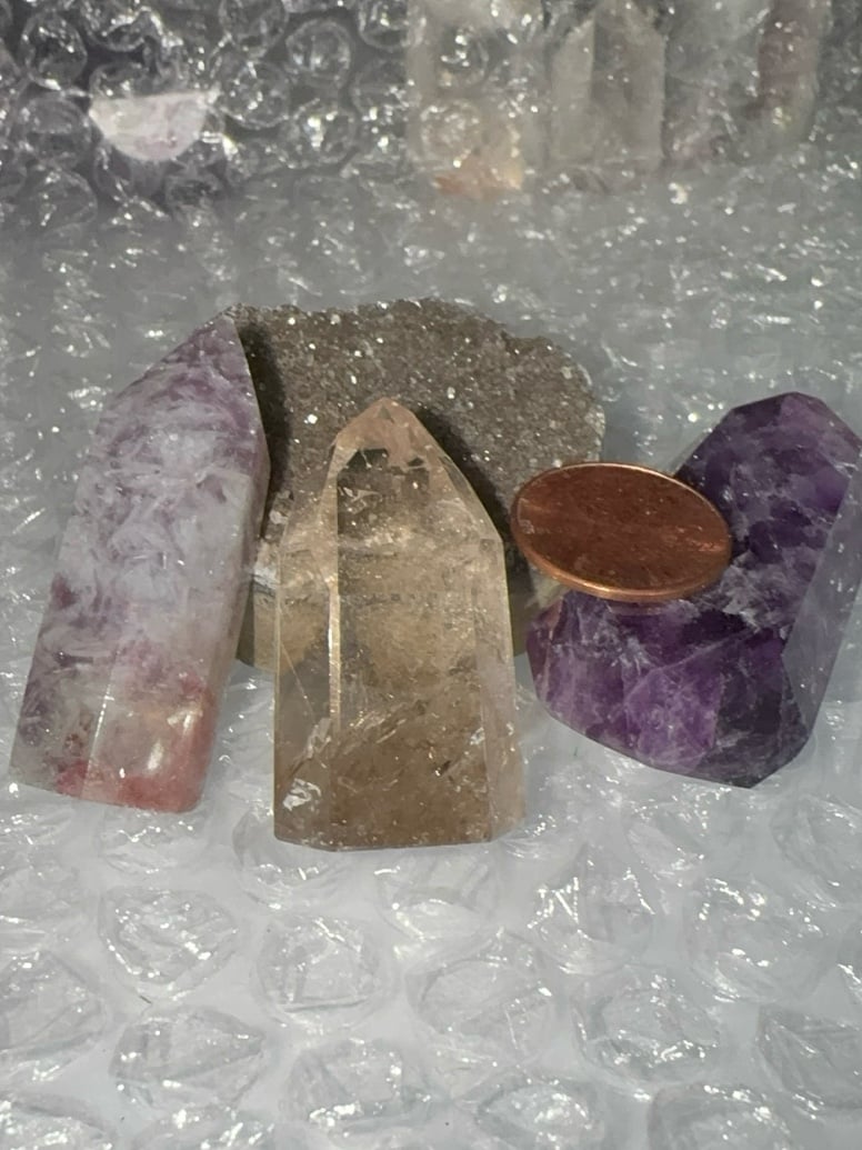 You’ll get a baby citrine tower with visible rutile threads, a rich purple amethyst palm stone, a lavender lepidolite baby tower with pinks, greens, and purples, and also sparkly druzy brown amethyst cut base with light agate banding.