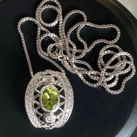 Gorgeous natural peridot set, beautifully filigree crafted in solid 925 sterling silver, platinum finish. The earrings are 14x16 mm in size with butterfly backs, and they weight 5 grams. The pendant measures 16x20 mm and the weight is also 5 grams. The box chain is 18” long, 1 mm wide, and stamped 925 and ITALY. Both earrings and pendant are stamped 925 for solid silver. See pictures for details. The set is new. Shipped in a nice gift box with USPS Ground Advantage Service.