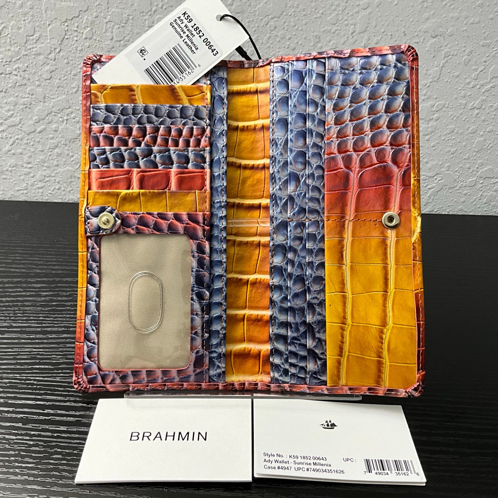 Color: Sunrise Millenia Genuine Leather = In my opinion this is shades of orange, red, yellow, blue and purple done in a giraffe pattern leather with some of the colors having a slight metallic finish