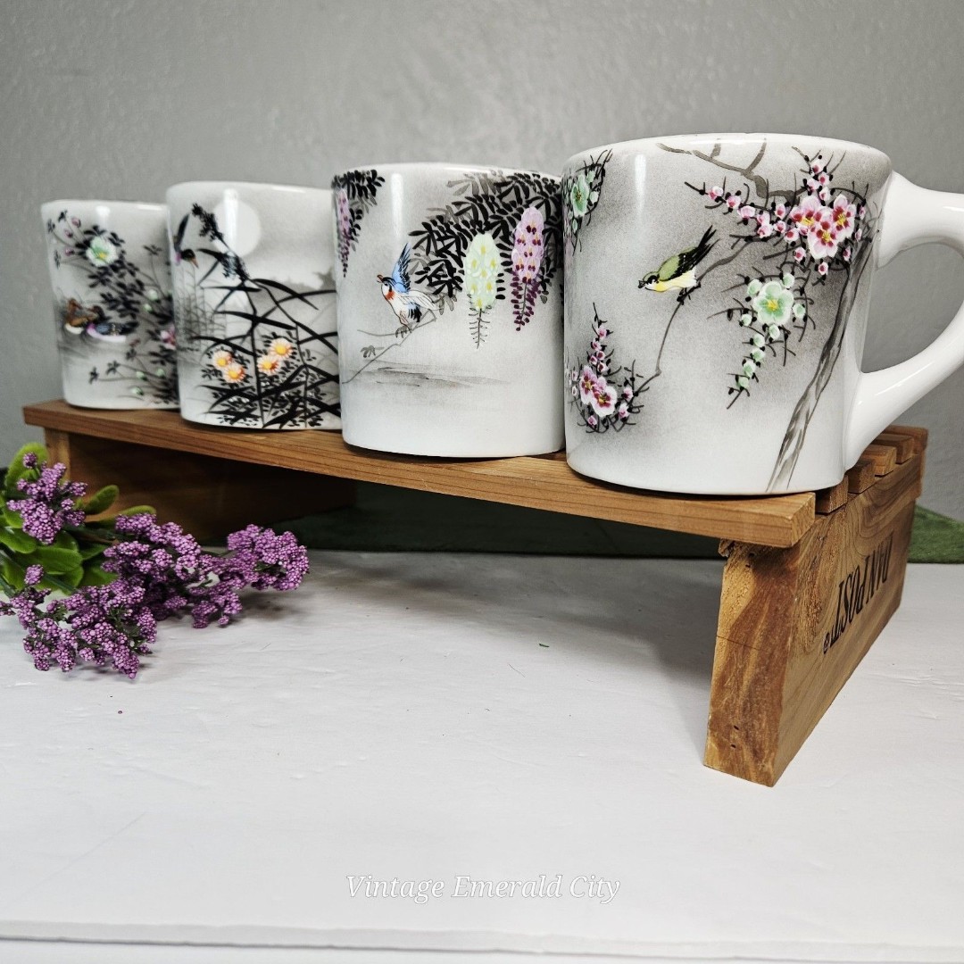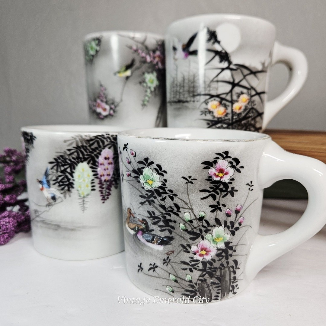 Beautiful Shozan Kutani porcelain mugs from Japan, 1950s1960s, each hand-painted with serene ducks, flowers, and branches in vibrant colors accented with gold trim. Fine craftsmanship typical of Kutani ware, marked Hand Painted Shozan Japan on base. Rare matching set of 4, showing light wear to gold rim but overall excellent display and functional condition.