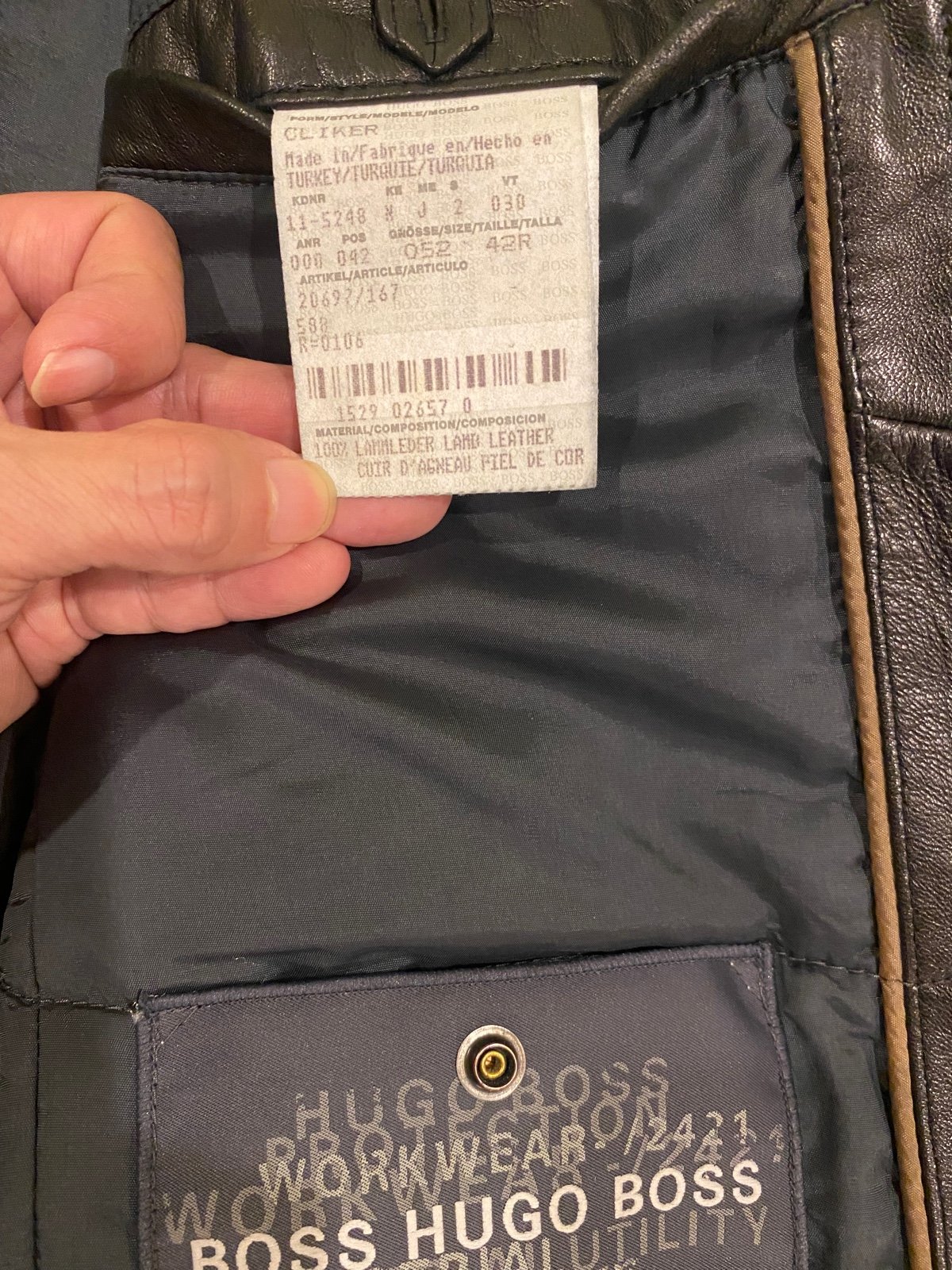 Hugo Boss motorcycle style mens leather ( lamb ) sleeve it’s fabric mix . Mens size is 42 regular. The jacket is in very good condition. Please review all pictures in detail before purchasing. This is a Luxurious Hugo Boss Lamb leather jacket .