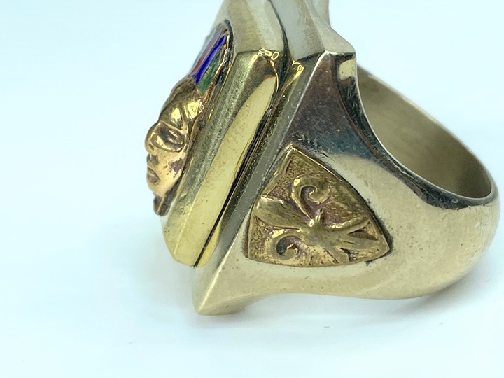 Vintage Enameled Biker's Indian Chief Mexican Ring. Size-10.5. Vintage 1940-50’s Enameled Indian Chief Mexican Ring measuring 1-1/8” at widest point and weighing 42.6 grams. Click images to enlarge for more details.