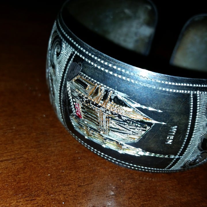 The cuff features a black enamel background. The enamel, as well as the silver, has been etched with the buildings and scenery, as well as intricate panels of flourish designs. Some of the scenery is colored with green, red, and gold.