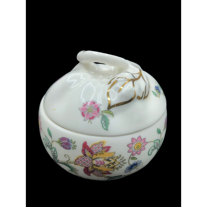 Experience timeless elegance with the Minton Haddon Hall Jam/Jelly jar. Crafted from exquisite bone china in England, this discontinued piece features a captivating floral design and a delicate stem finial. A perfect addition to elevate your tableware collection. Hand wash recommended to maintain its beauty.