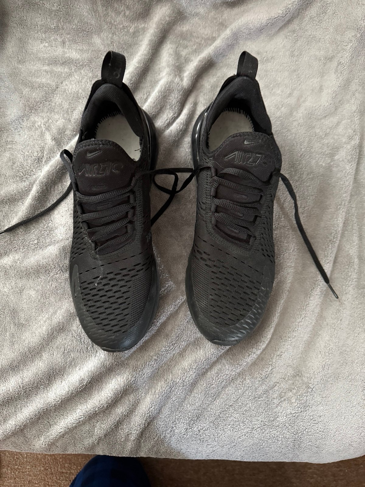 Nike Air Max 270s in the sleek all-black colorway. Still in good shape with only light signs of wear — no major scuffs or tears. Super comfortable and stylish for everyday wear or workouts.