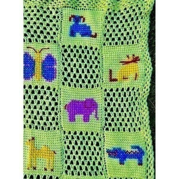 Beautiful baby blanket with colorful crocheted animals. There is one whisker on the cat that needs to be reattached. There are no tears or stains. It has been cleaned and sanitized. It is in great vintage condition. Please look at all the photos to ensure that you agree with my assessment.