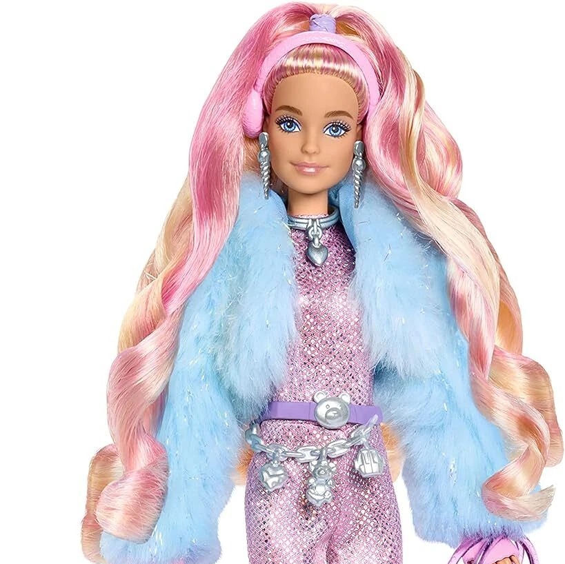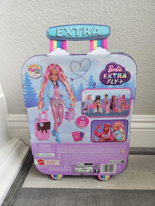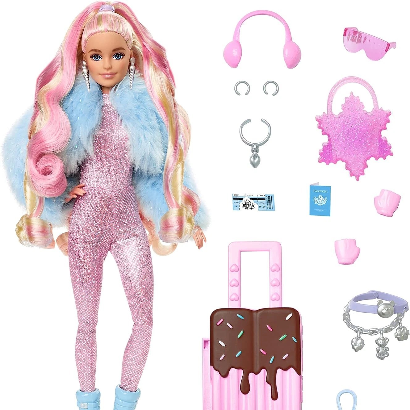 Barbie comes with 15 accessories such as pink earmuffs, fingerless gloves, snow boots, goggles, popsicle-inspired suitcase, snowflake luggage tag, passport, plane ticket, and snowflake bag.