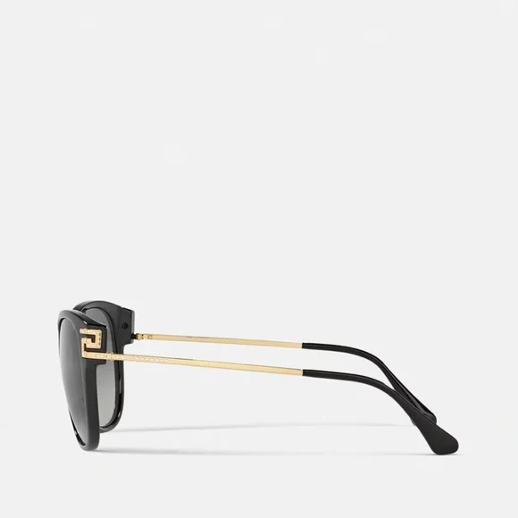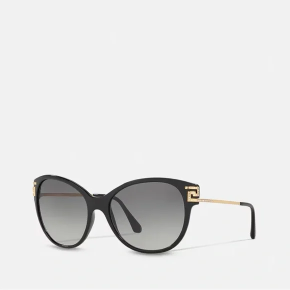 These Versace sunglasses showcase a striking black frame with luxurious gold accents, embodying a perfect blend of classic elegance and modern style. The cat-eye design features slightly upswept corners, adding a touch of sophistication to any look. Gradient gray lenses complete the chic aesthetic, offering both style and sun protection.never worn beforeincludes original case, cloth, and box :)