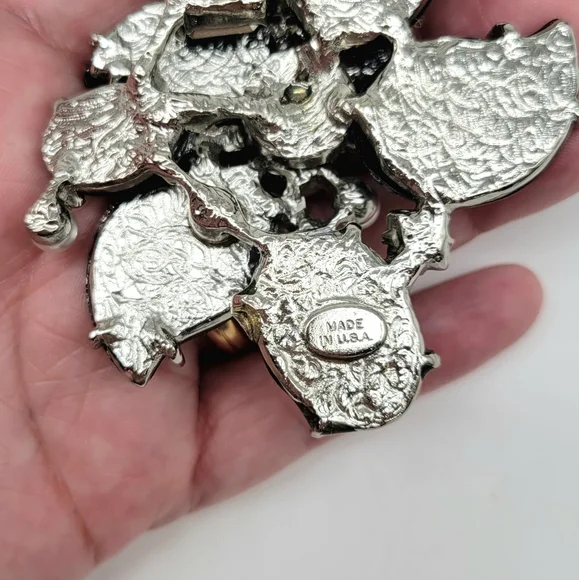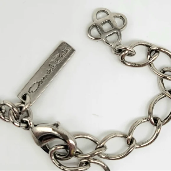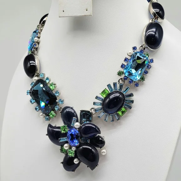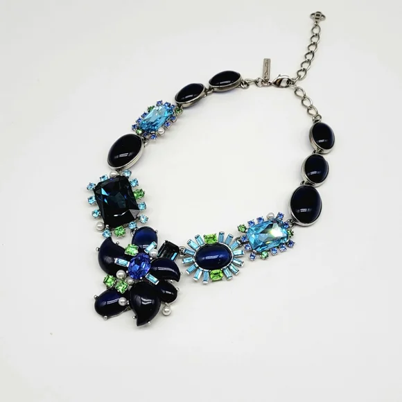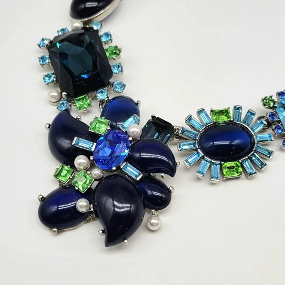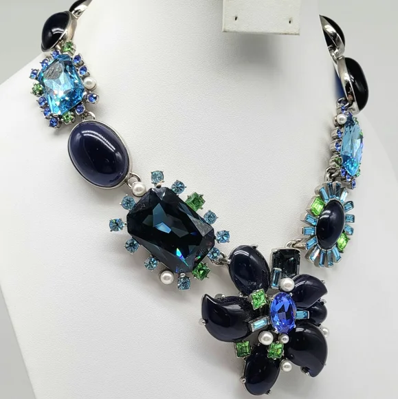 Thank you for visiting runwayreadyjewelry.com! (@runwayreadyjewelry on instagram + pinterest)Measurements: 16"L with 4" extender chain. Center flower pendant is 2.5"W by 3"L.Metal: Silver ToneFindings: Lobster ClawFinish: PolishedWeight: 215gEXCELLENT CONDITIONPerfect symmetry is SO overrated. Take a walk on the fun side with this asymmetrical stunner from world famous jewelry designer Oscar de la Renta! This HEAVY glass and Swarovski Crystal necklace weighs in at 215g, you can truly FEEL its quality and craftsmanship. Each stone has been set into icy cool polished silver tone metal that makes the perfect backdrop for the intense blue colors. Stone shades include dark navy-blue glass, sapphire crystal, blue topaz crystal, peridot crystal and tanzanite (blue-purple) crystal. In addition to the crystals are a scattering of bright white glass pearls for a feminine touch. Perfect for any event, dance, wedding, or anytime you want to add some gorgeous color in your life. Designer signed 'Oscar de la Renta', 'Made in USA', with signature clover charm at the end of the extender chain.True beauty is in the imperfections!