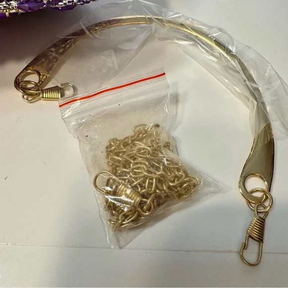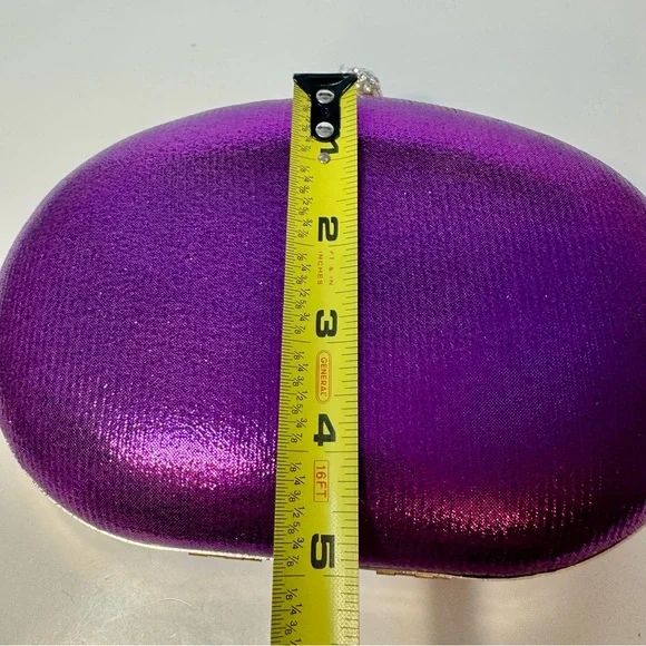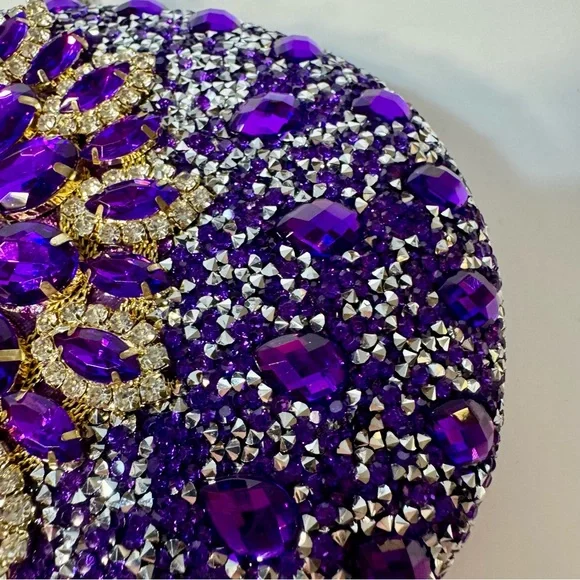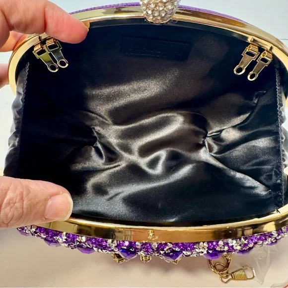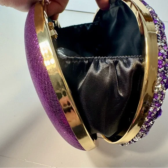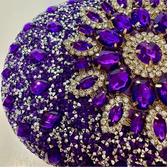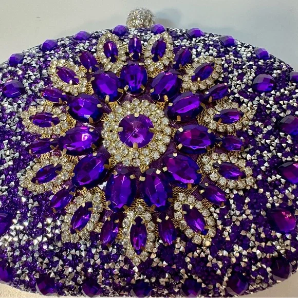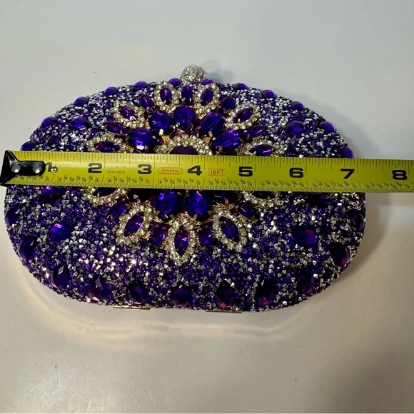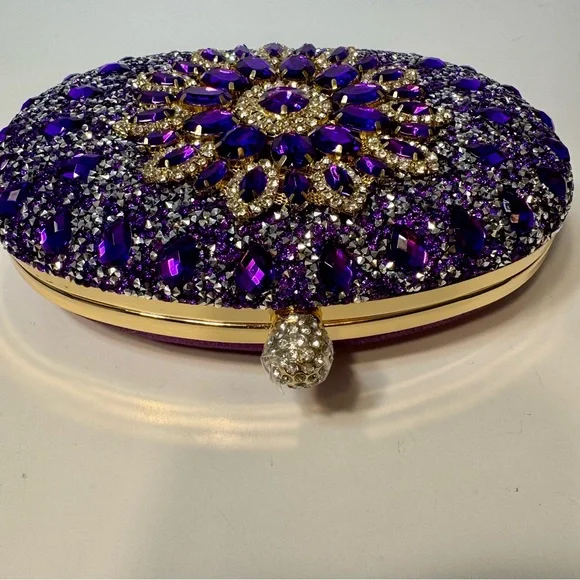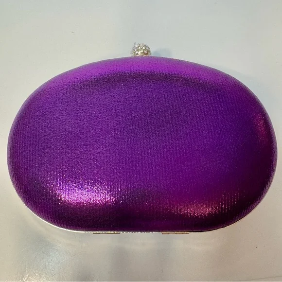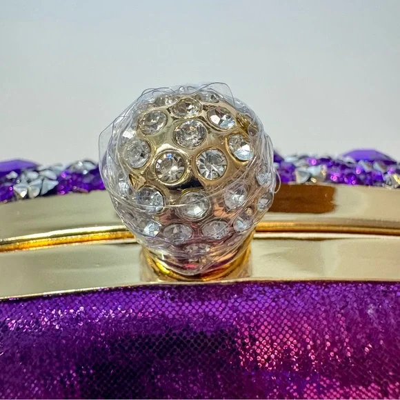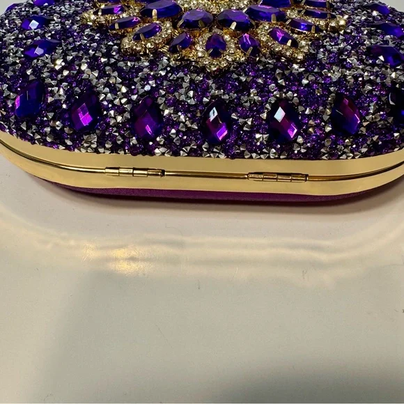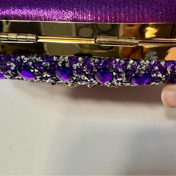 Ramla Sparkling purple rhinestones Womens Clutch Handbag with detachable metal chain strap handle. This Ramla faux Diamond Encrusted Clutch Bag is a stunning addition to any outfit. This dazzling clutch effortlessly combines glitz, glamour, and practicality. Approx. 5”H x 7”L. With its luxurious design and spacious interior for essentials, it's the perfect companion for your evening out, sure to turn heads. Elevate your style with this vegan & cruelty-free clutch, where every detail speaks volumes of elegance and allure. Comes with detachable gold tone handle and crossbody strap.MSRP $180