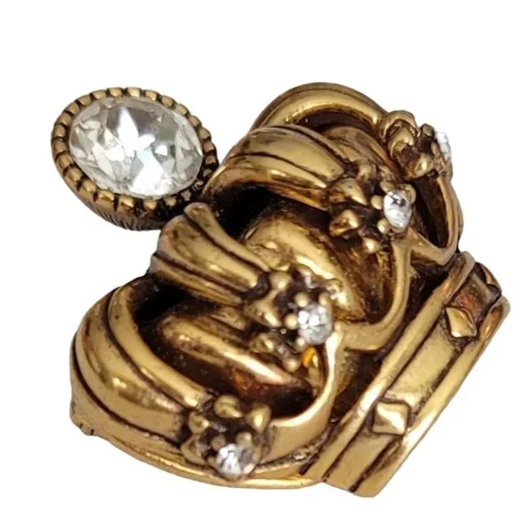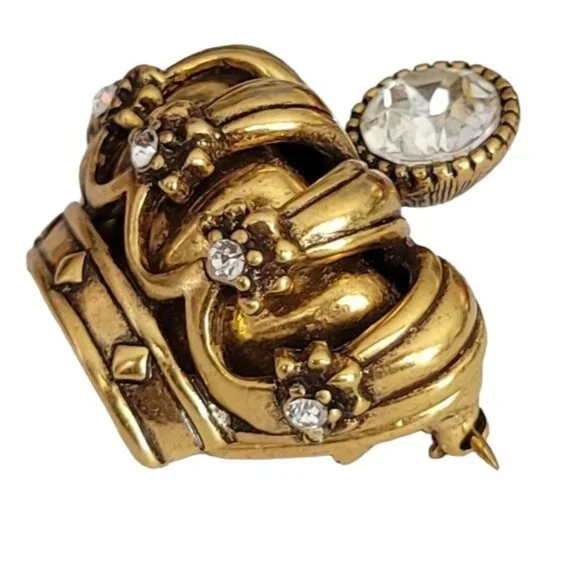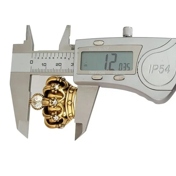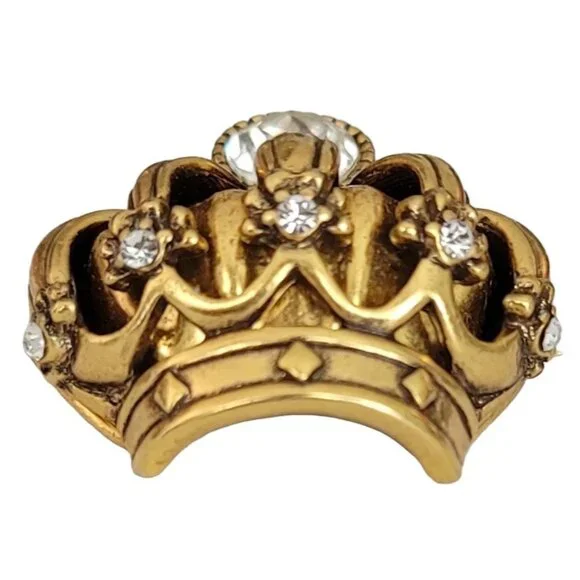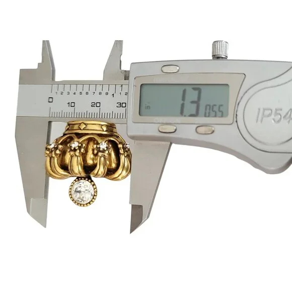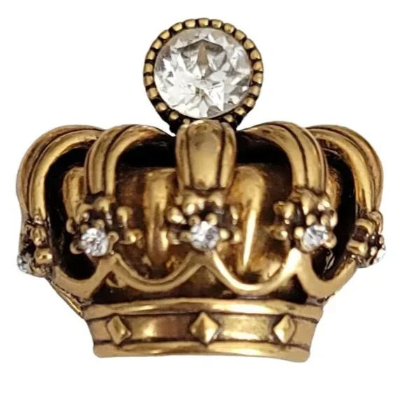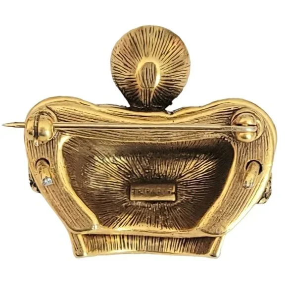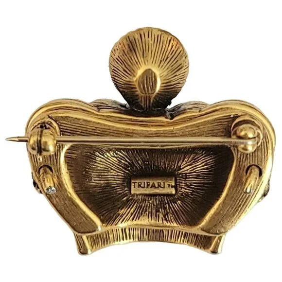 Trifari TM Gold Tone Clear Rhinestone Crown Brooch, Signed K596This Vintage Trifari Crown brooch is impeccably stunning.An intricately detailed crown figural crafted from high-quality gleaming gold tone metal with accents of smaller round clear rhinestones and a central sparkling faceted clear rhinestone at the top of the crown.It measures approximately 1.3 inches in width and 1.2 inches in length.The back of this pin is marked TRIFARI TM.Finished with a secure locking pin that functions properly and is in good vintage condition. Please carefully review the images because they are part of this listing and reflect important details, sizes, and information. Images often reflect items larger than their actual size. This is unavoidable and necessary to provide accurate photo details of items.Most items come packaged in our It Still Glitters store box. Unless expressly stated in this listing, the item does not come with an original box, pouch, or packaging. We are happy to combine ship upon request, but please add all items to your cart before submitting payment.Add us to your fav and sign up for our occasional email so you'll be in the loop when we add awesome new pieces or have pop-up sales. Please note that if your purchase includes a 10k, 12k, 14k, 18k, etc. piece with a clasp, there may be a component in the clasp that reacts to a magnet. All of our gold is tested. #Itstillglitters #It Still Glitters#Reuse #Reduce #RewearSize: Womens 1.3"W; 1.2"HCondi
