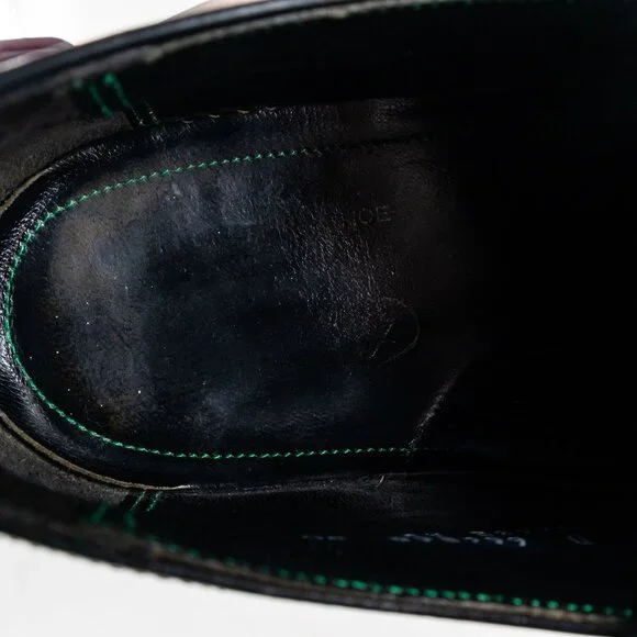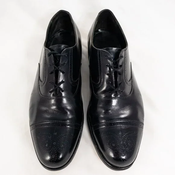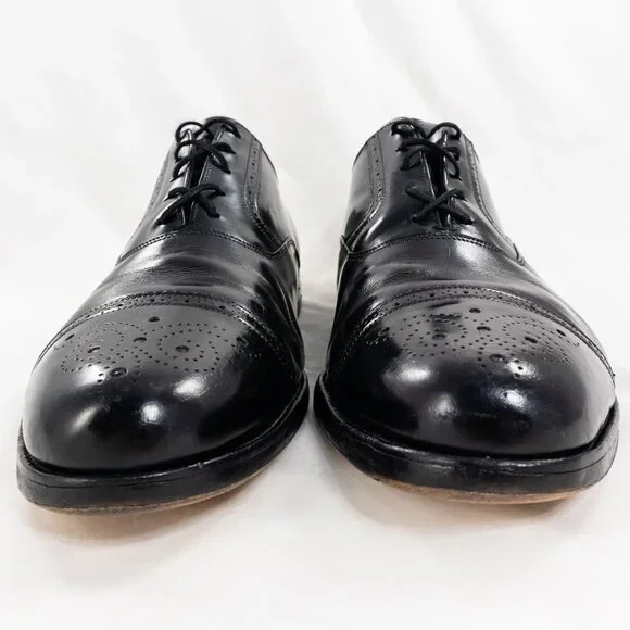 Exquisite Florsheim Imperial Oxfords with Baroque DetailingOwn a pair of timeless elegance with these Florsheim Imperial Baroque Cap-Toe Balmoral Oxfords, crafted in January 1977 (AG Date Code). These shoes combine exceptional craftsmanship with intricate design elements, showcasing the fine details that define Florsheim's Imperial line.Design: Classic Balmoral silhouette with a baroque cap-toe and facing, featuring delicate perforation and broguing that elevates their formal appeal.Construction: Durable Goodyear welt and full-grain leather uppers ensure both longevity and sophistication.Heel: Equipped with the iconic Cat’s Paw heel taps, a hallmark of mid-century shoe artistry.Style: Perfect for business attire, formal occasions, or as a collector's masterpiece.Polished to enhance their original luster, these shoes exude timeless charm while preserving their authentic patina. The leather shows some creasing, which is typical for shoes of this age and reflects gentle wear while maintaining the structure and integrity of the material.Measurements:Size: 12D (Men’s) Regular WidthLength (Insole): Approx. 12.5 inches (31.75 cm)Width (Outsole): Approx. 4.25 inches (10.8 cm)Heel Height: Approx. 1 inch (2.54 cm)Step into vintage sophistication with these Florsheim Imperial Balmoral Oxfords. Designed for timeless elegance, they are a must-have for collectors or those seeking refined formal footwear. Grab them before they’re gone!