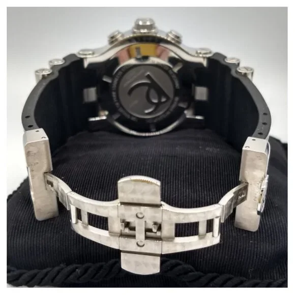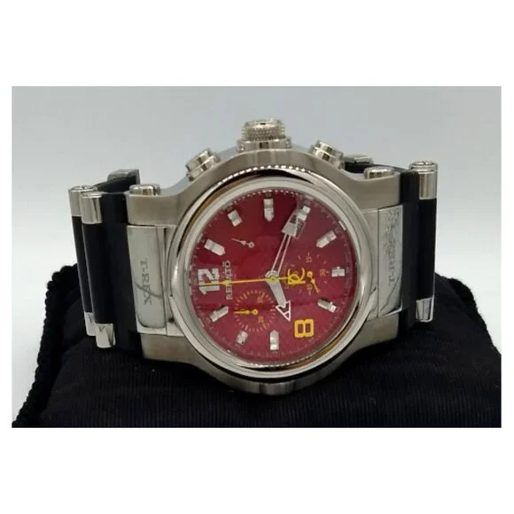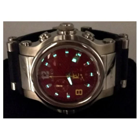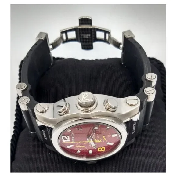 Swiss movement•Case and Dial-Shape: Round-Case Size: 48mm-Case Material: Stainless Steel-Bezel: Stainless Steel-Bezel Color: None-Crown Type: Screw Down-Crystal Type: Mineral-Dial Material: Red Carbon Fiber-Case Back: Screwback•Movement-Components: Swiss Movement-Caliber: G10.711 (battery cell 394/SR936SW), 22 Jewels-Function Type: Quartz•Water Resistance: 300mt (30 ATM)•Band-Type: Material: Rubber/Stainless Steel-Tone: Black, Steel-Length: 210mm-Size: 27mm tapering-Clasp: Push-button Butterfly Deployment•Other-Seconds Hand-Chronograph: 30-minutes, 60-seconds, 1/10th-second Subdials-Calendar Day-Date-Luminous Hands/Hour Markers-Function PushersCondition is very good. Normal wear; scratch on case back from previous battery change. No box.See pics for condition as they are part of the description. Due to differences in lighting, monitors, cameras, etc., you may see color variations and reflections. Please ask questions before purchasing. All purchases are video recorded during the packing and shipment process.