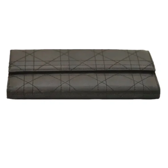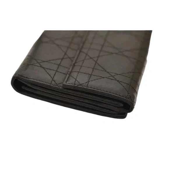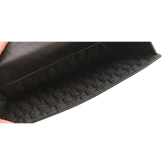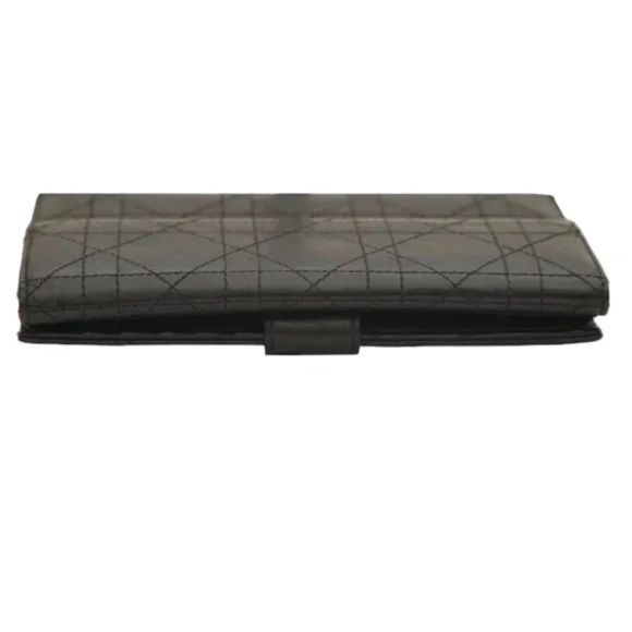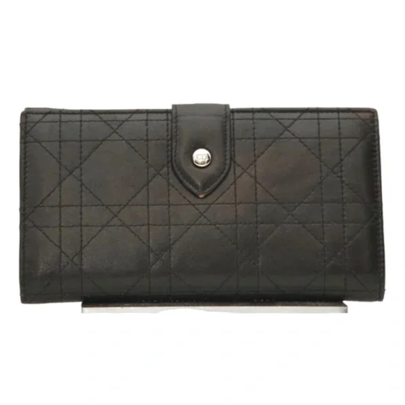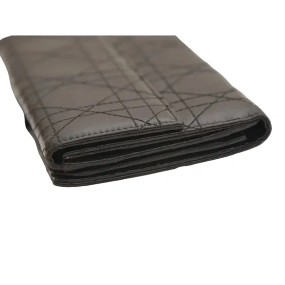 Christian Dior Black Leather Cannage Long Flap WalletFull change compartment on one side.The other side bills and credit cards.Flap closure snap closure.It is noted there is visible wear to this wallet.Please review all pictures.There is surface scratches wear to exterior and interior of wallet.The logo hardware on flap closure light scratches; at the tip of flap the leather has scuffed.Light wear to coin compartment.The interior has indentations from credit card slots and wear/scratches to leather.Credit card slots stretched.