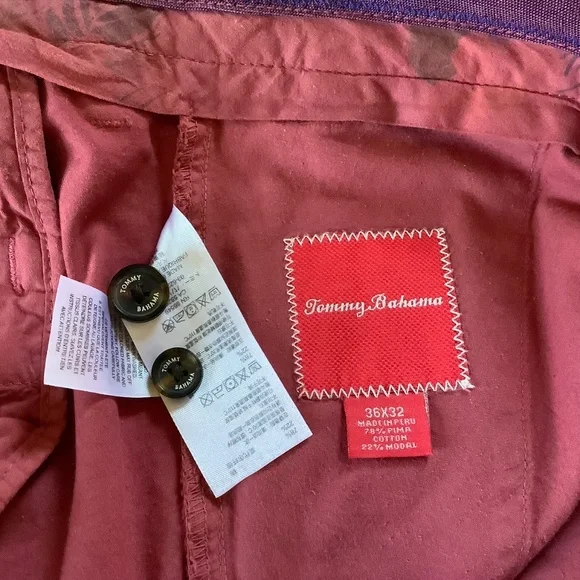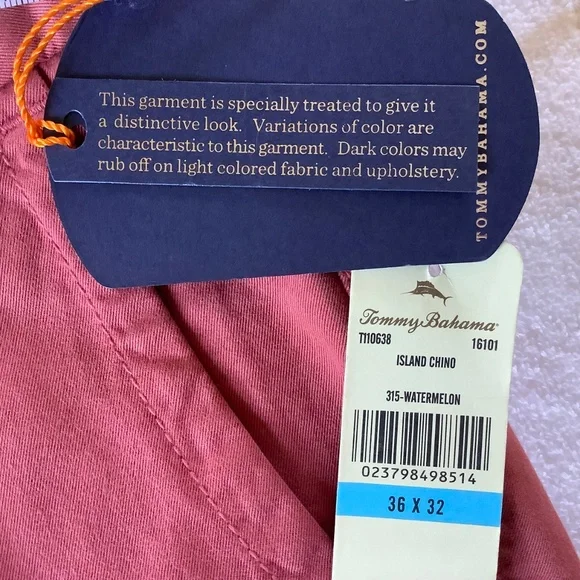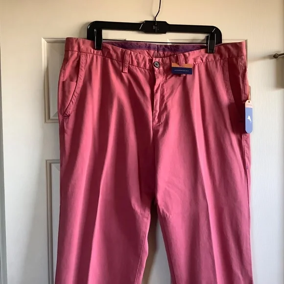 Tommy Bahama Cotton Modal Island Chino Pants Size 36/32Business Casual Resort Ready Relaxed Fit Chino Pants Authentic Fit Straight Leg Flat Front 5 Pockets Color: Watermelon Size: 36/3278% Pima Cotton 22% Modal. Pima cotton is the highest quality of cotton produced.Machine wash cold with like colors gentle cycle Tumble dry low Do not dry clean New with tags Unused Unworn In Perfect Condition
