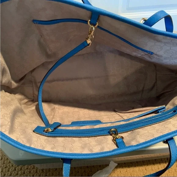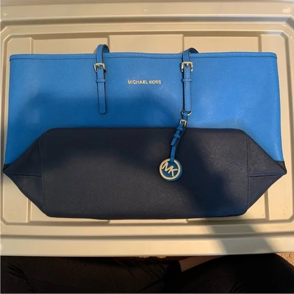 This Michael Kors tote bag features a bold blue and black color-blocked design, offering a stylish and modern look. The structured silhouette is complemented by elegant silver-toned hardware, adding a touch of sophistication. With its matching blue straps, this tote is both functional and fashionable, perfect for any occasion.