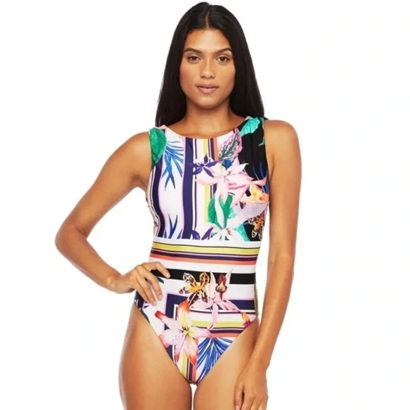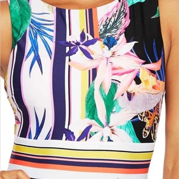 Fabric Type: 80% Nylon, 20% ElastaneCare Instructions: Hand Wash OnlyOrigin: ImportedClosure Type: Pull OnThis tropical print is vacation-ready when you are!The Trina Turk Treasure Cove Boatneck Maillot features a high-cut, bateau neckline with wide straps.This stunning one piece swimsuit is a dreamy, tropical, floral fantasy done in the incomparable Trina Turk style!High Neck One PieceBoatneck necklineThick back strapsRemovable cupsModerate coverage