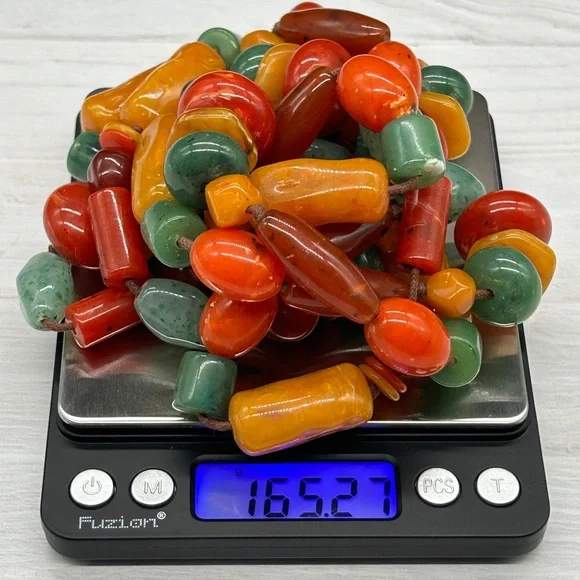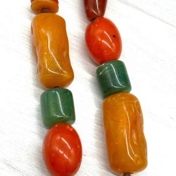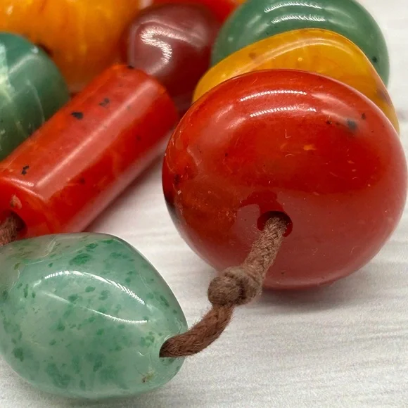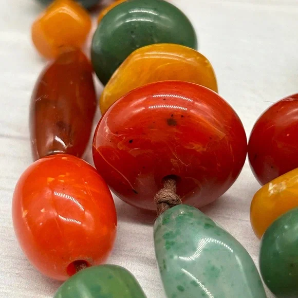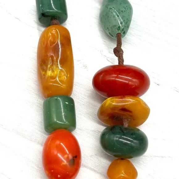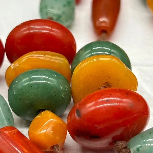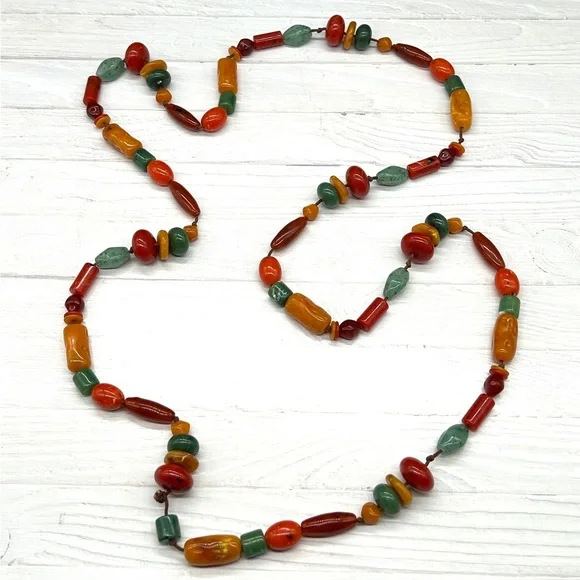 This necklace is so cool!It's a vintage beaded necklace measuring 64" long. Many ways to wear this one! It features multiple shapes, sizes and colors of beads. I'm not sure if they are Bakelite or lucite or something else. It is quite heavy and it is really good quality. The beads are strung on brown knotted cording which is in great condition. Just a super fun necklace and great addition to your collection!About Me:Check my feedback and buy with confidence! If you buy 3 or more items from my closet, you automatically get 15% off. I usually discount a little more from that!And I always include a nice gift with purchase.I take pride in selecting quality items for my closet and delivering them to you with the utmost care.I hand polish every item I sell so that they are ready for you to enjoy! I ship securely and quickly.Low ballers will be ignored or blocked.Certain parts of my description may be collected using generative AI. An occasional error could be made.Our home is smoke free! I do not use fabric sheets or strong perfumes in my shipping materials out of respect for those with sensitivity to chemicals.If you are dissatisfied or feel I have misrepresented an item, I don't question it. Happy Poshing! ❤️Amy