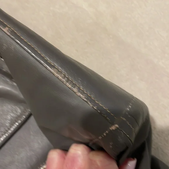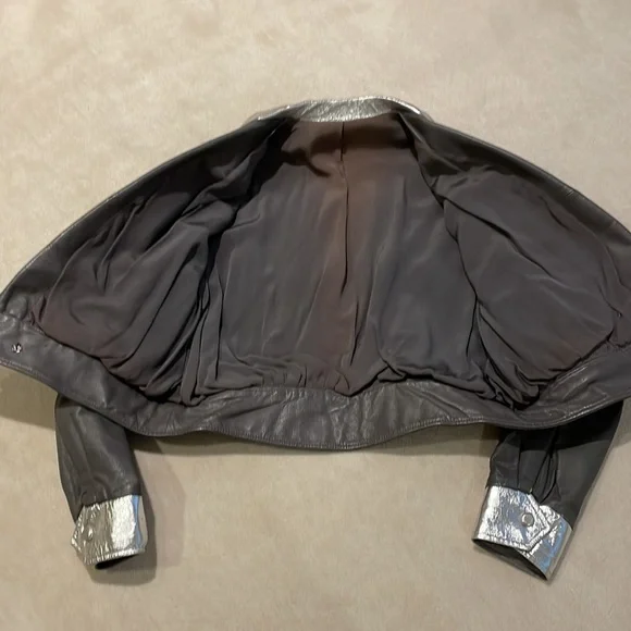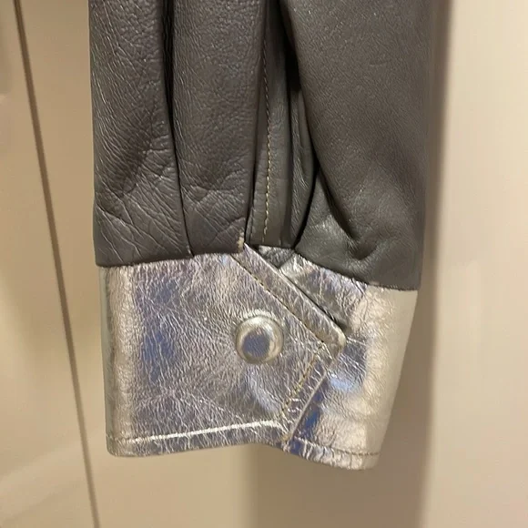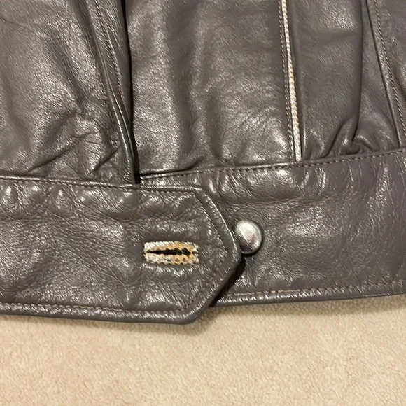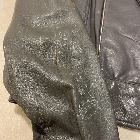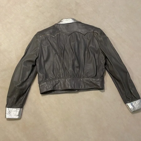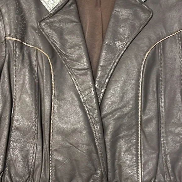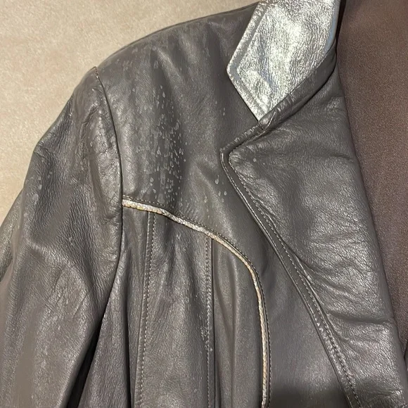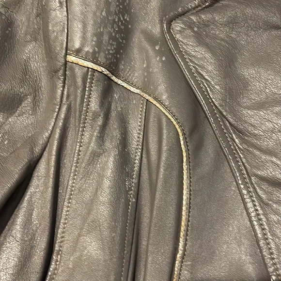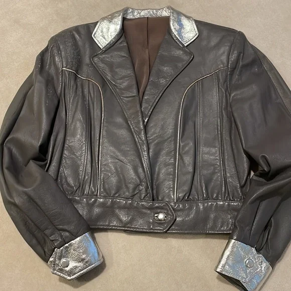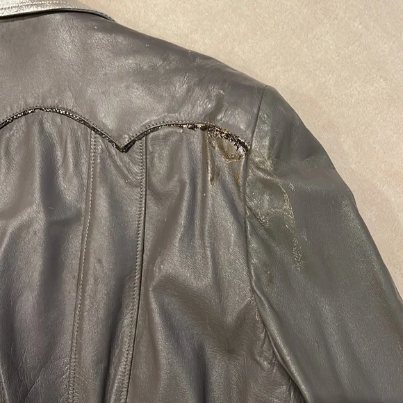 1940’s VINTAGE EISENHOWER style Jacket. Gray leather body and sleeves. Silver leather collar, cuffs and detailed piping.Notched collar Please see all photos.This jacket was stored in a closet that had a leak.Leaving it with what appears to be water spots along right shoulder, sleeve and parts of right back shoulder. There is some wear along parts of the silver piping. The interior lining has some fading. The style features slit sidepockets and scallop detailing along the back shoulders. This was a custom made piece. It’s a beauty and has a great deal of character. There is no manufactures label. Please note- I haven’t looked into whether the damages can be cleaned or repaired.I will leave that up to the buyer.This jacket is from another era.It deserves to be brought back to life and hopefully find a new wearer that will be able to enjoy it and treasure it for years to come.My guess it’s about a size 12. Approx 20” across bustLength approx 21”.